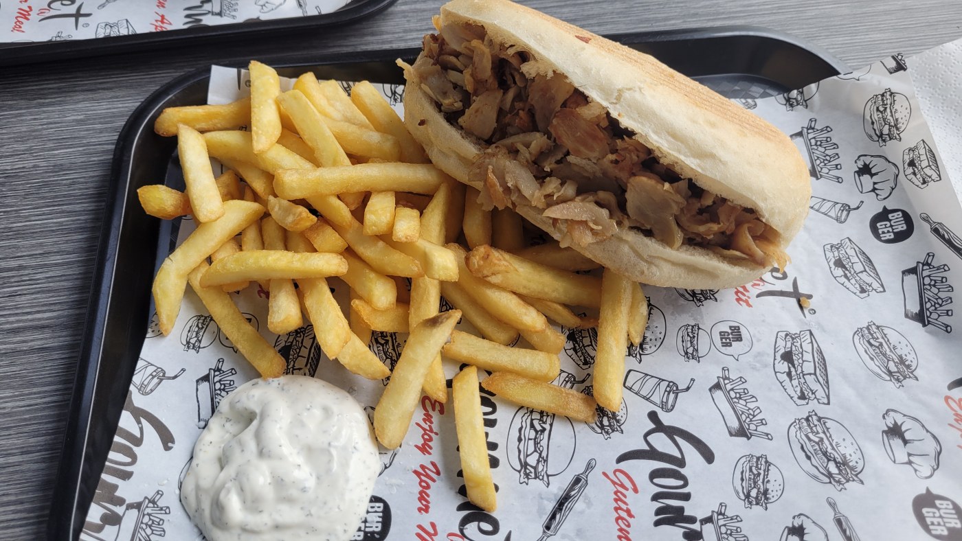 La viande est bonne, même si la broche n’est pas maison. Le pain est bon lui aussi, sans être fait maison. Les sauces également. La qualité est bien présente, même si le prix est légèrement élevé. Les commandes sont prêtes à l’heure et l’accueil est bon.